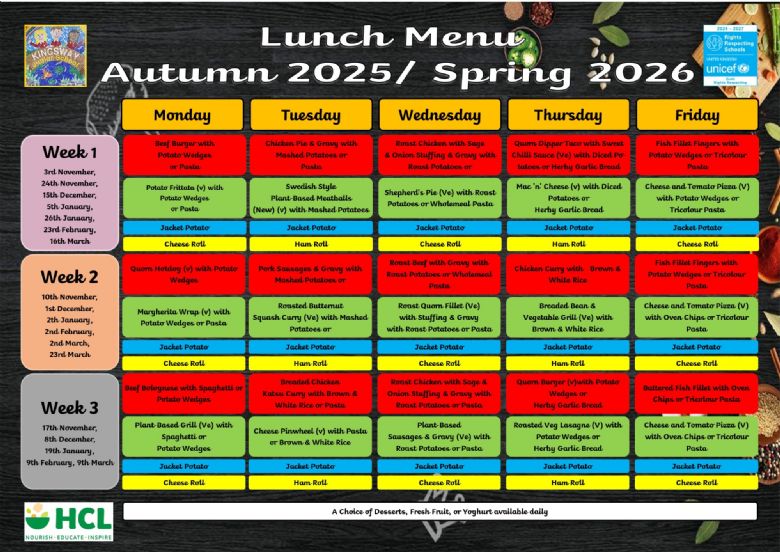 Please note if your child has never taken school meals with us before, please speak to the school office prior to commencement of meals. If your child has food allergies of any kind, you must visit the HCL website and complete the online application. https://specialmenu.hcl.co.uk/