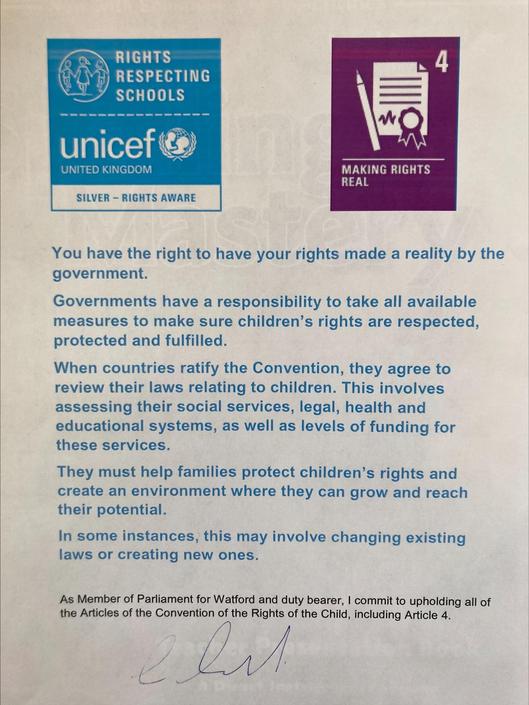 The staff were very proud of the children's thoughtful questions and the respect that they showed to Dean. We all learnt a lot about what MPs do and how government works. This helps us to understand how our rights are upheld by our government, like article 4 of the Convention of the Rights of the Child tells us: Governments have a responsibility to take all available measures to make sure children's rights are respected, protected and fulfilled. Dean signed an agreement to uphold this article and represent us and our rights in parliament. We are very grateful to him and his colleagues for taking the time to help us.